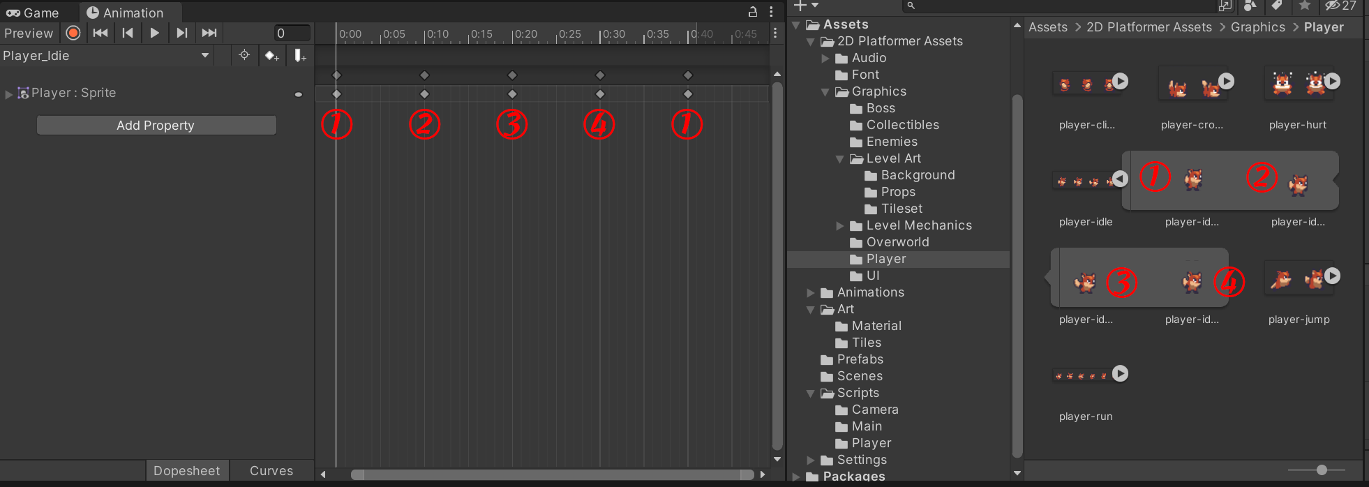 0:60为一秒,我们空闲状态总共有四幅图像,我们间隔10帧放置一幅,最后在第40帧的时候再放一个第一幅,使得小狐狸空闲状态的动画流畅。