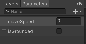 首先我们在 Animator 窗口中,点击 Parameter ,创建一个 float 类型的 moveSpeed 和 bool 类型的 isGrounded 用来作为动画进入以及退出的条件。